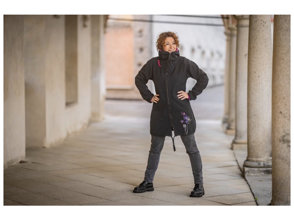 Kapucka je dvojitá, do boku jsou všity kapsy. Bunda je projmutá přes boky volná, poté v délce stažena.
