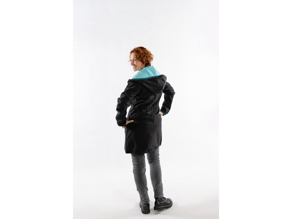 Kapucka je dvojitá, do boku jsou všity kapsy. Bunda je projmutá přes boky volná, poté v délce stažena.