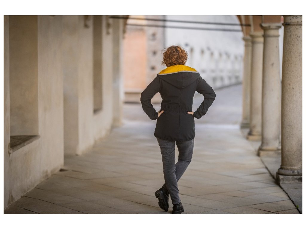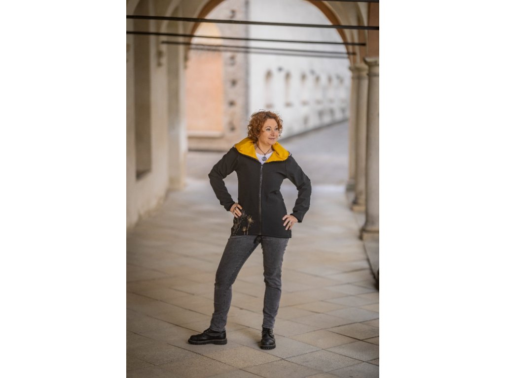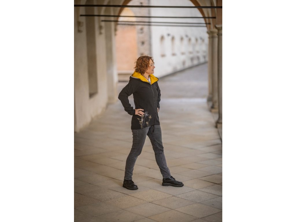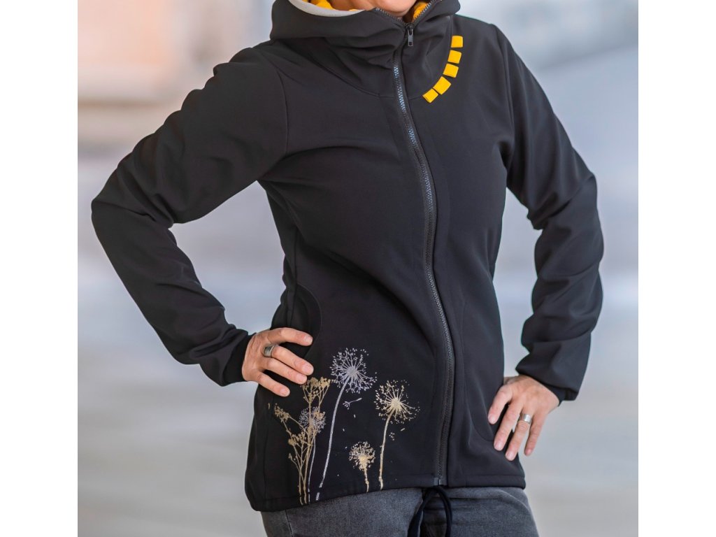 Kapucka je dvojitá, do boku jsou všity kapsy. Bunda je projmutá přes boky volná, poté v délce stažena.
