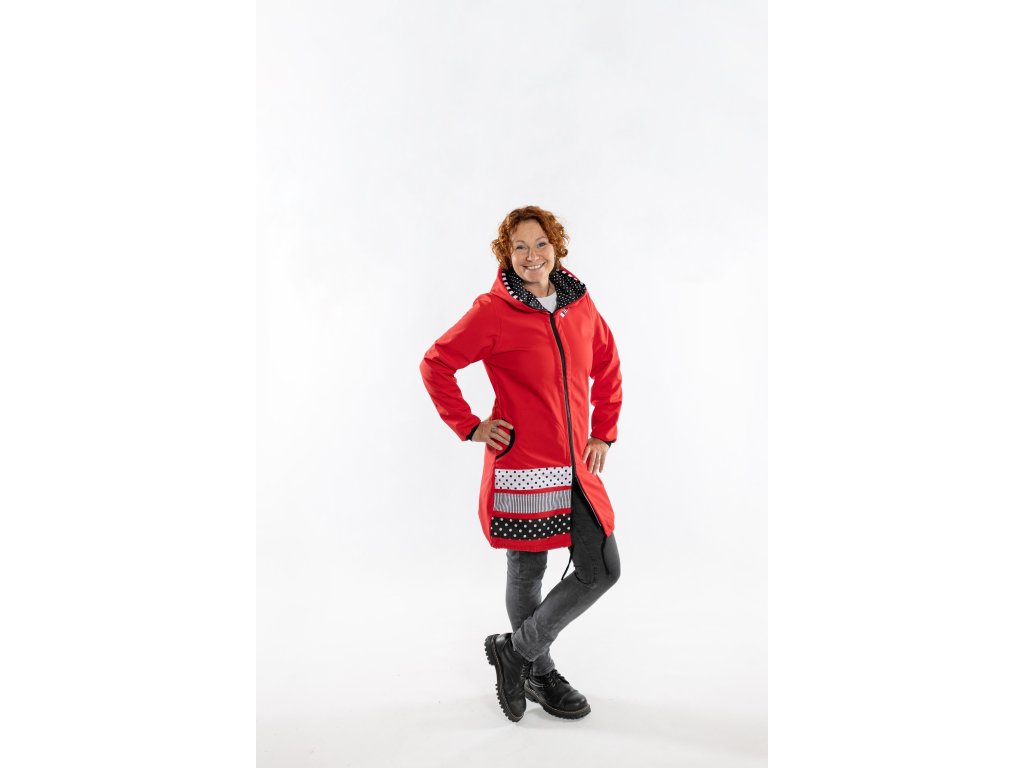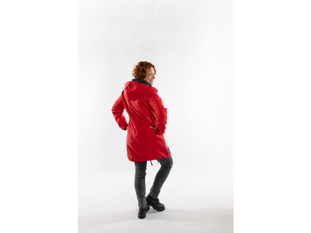 Kapucka je dvojitá, do boku jsou všity kapsy. Bunda je projmutá přes boky volná, poté v délce stažena.