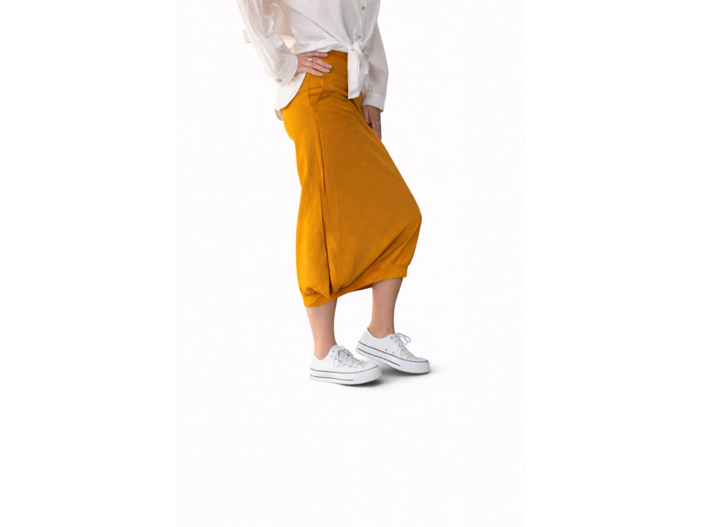 Do boku jsou všité kapsy, délka je všita do lemu a po stranách jsou ozdobné rozparky